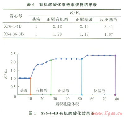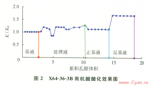 可以看出,采用用有機(jī)酸酸化后,巖樣的滲透率有了明顯的提高。說(shuō)明酸液配方的選擇對(duì)酸敏實(shí)驗(yàn)結(jié)果可產(chǎn)生“質(zhì)變”的影響[9-11]。