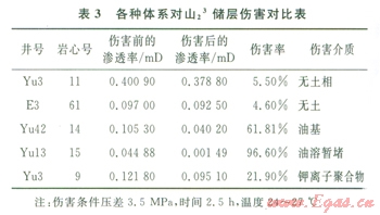 從表3中實(shí)驗(yàn)數(shù)據(jù)可以看出,對比的幾種常用鉆井液完井液體系中,無土相低傷害暫堵鉆井液完井液體系的靜態(tài)傷害率最小,小于10%,屬于較輕度傷害。