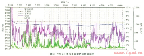 鉆井過程中實(shí)時(shí)利用隨鉆測(cè)井與綜合錄井,協(xié)助地質(zhì)工程師進(jìn)行地層精細(xì)評(píng)價(jià),準(zhǔn)確判斷地層[5],同時(shí),通過加強(qiáng)現(xiàn)場(chǎng)隨鉆地質(zhì)導(dǎo)向能力,在水平段的鉆井過程中及時(shí)準(zhǔn)確地確定地層傾角和儲(chǔ)層的地質(zhì)走向,通過伽馬和深、淺電阻率的探測(cè)深度及響應(yīng),建立地層預(yù)測(cè)數(shù)學(xué)模型,避免井眼軌跡的較大幅度調(diào)整。在確保了長水平段有效延伸的前提下,實(shí)現(xiàn)了在儲(chǔ)層中鉆進(jìn),使水平段的儲(chǔ)層鉆遇率高達(dá)93.2%。實(shí)時(shí)指導(dǎo)井眼軌跡的幾何走向如圖2所示。