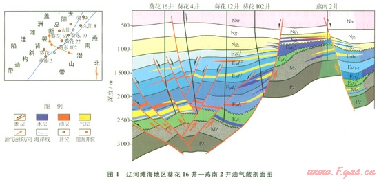 2)灘海西部地區(qū)油氣分布層間差異大,油氣藏類型變化快,油氣藏主要沿砂體和斷裂分布;中部地區(qū)油氣主要分布在斷裂發(fā)育且封蓋條件較好的層位,油氣性質(zhì)差異明顯;東部地區(qū)以發(fā)育氣藏為主,平面上分布穩(wěn)定,具有油氣分布井段長、砂體延伸范圍小、相變快的特點,不同斷塊、不同組段油氣發(fā)育程度差異大,并以中淺部層系多套氣藏疊置發(fā)育為主。