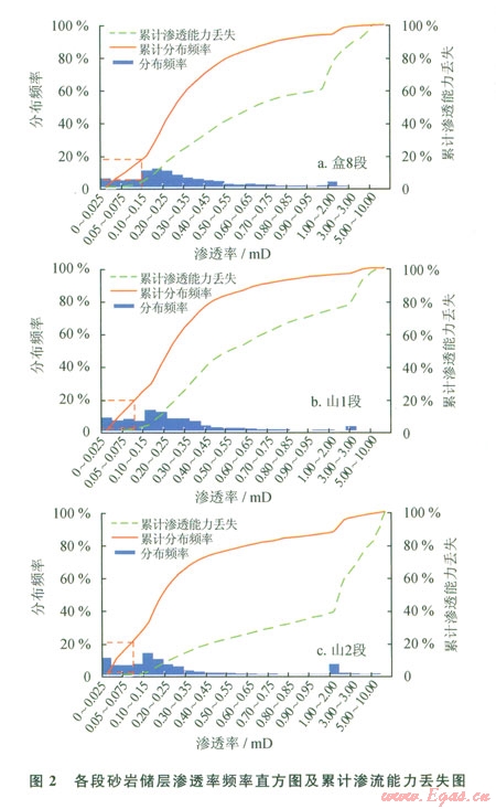 經(jīng)對蘇東地區(qū)盒8段、山1段、山2段的物性特征、巖性特征和孔隙結(jié)構(gòu)特征分析,認為該區(qū)儲層為典型的中低孔-低孔、低滲-特低滲儲層。孔隙度為5%~l5%,滲透率為0.1~1.0 mD,滲透率能力較差。按照經(jīng)驗統(tǒng)計法(圖1、2),考慮到長慶油田低孔、低滲的儲層特點,按照累計頻率丟失不超過總累計的20%,累計儲能、產(chǎn)能丟失不超過總累計的l0%。當