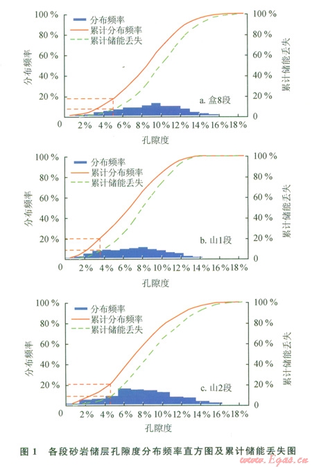 經(jīng)驗統(tǒng)計法是以巖心分析孔隙度、滲透率資料為基礎(chǔ),以低孔滲段累計儲滲能力丟失占總累計的5%左右為界限的一種累計頻率統(tǒng)計法,現(xiàn)已被國內(nèi)各大油田所采用[1-6]。利用蘇東地區(qū)盒8段、山1段、山2段儲層常規(guī)物性分析資料,編制的孔隙度、滲透率頻率分布、累計頻率及累計能力丟失曲線見圖l、2。孔隙度儲氣能力、滲透率產(chǎn)氣能力的計算公式為: