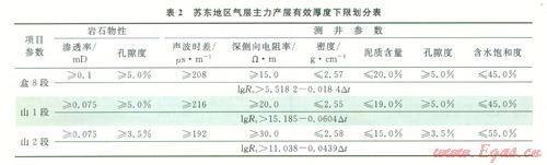 1)根據(jù)以上幾種方法,綜合對比選取了蘇東地區(qū)盒8段砂巖孔隙度下限為5.0%,滲透率下限為0.10mD,含氣飽和度下限為55%。山1段孔隙度下限為4.0%,滲透率下限為0.075 mD,含氣飽和度下限為55%。山2段砂巖孔隙度下限為3.5%,滲透率下限為0.075 mD,含氣飽和度下限為45%。