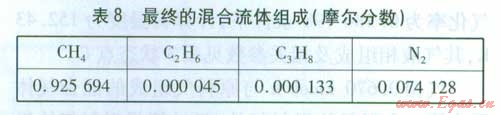 繼續(xù)按上述方法計(jì)算出每次引射所得出的引射氣體、被引射氣體及混合流體的組成。將所得到的混合流體在壓力為l.2 MPa及氣化率為0.67條件下所得到的液相,節(jié)流至壓力為0.4 MPa,做等焓計(jì)算所獲得的液相組成等于或接近于原料氣組成,且LNG收率等于或接近于l時(shí),計(jì)算完成。計(jì)算收斂條件為:液相LNG與天然氣任一組分的摩爾分?jǐn)?shù)的絕對(duì)誤差不大于±0.000 002,LNG收率的絕對(duì)誤差不大于±0.000 005。