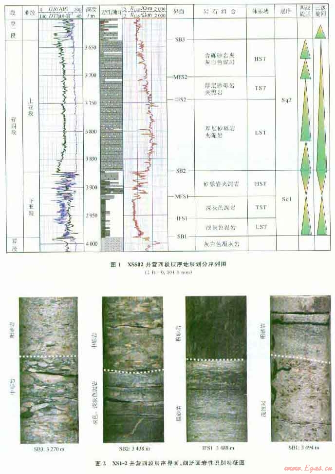 在測井曲線上,SB3界面上的砂巖為明顯低伽馬值,而界面之下的砂巖或砂礫巖為高伽馬值。且界面之下聲波時差值降低(圖1)。