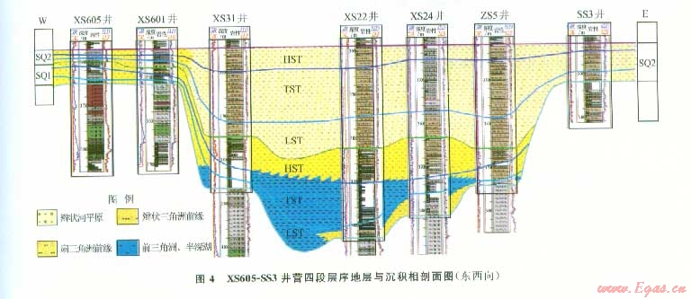 2)層序發(fā)育具明顯特征,營四段下層序(Sq1)分布僅局限在斷陷中心部位,發(fā)育半深湖一扇三角洲前緣亞相,以暗色泥巖為主。營四段上層序(Sq2)則是在斷陷變?yōu)橐粋€完整大湖盆的背景條件下形成的。