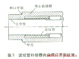 在暖管過程中,排潮管排出大量汽水混合物,管道沿線局部位置有熱水滲出地面。經(jīng)過分析,選擇若干開挖點,開挖后進一步發(fā)現(xiàn)工作管與外護管問的絕熱層有大量進水,有4處外護管接口漏焊,有1處波紋管補償器外殼有砂眼漏汽,部分波紋管補償器外殼兩端變形嚴重、臺肩部位的焊口開裂(見圖3)。