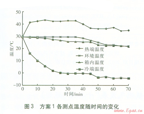 方案l:保持工作電壓為l2 V,散熱風扇運行,在正常環(huán)境溫度下,測量各測點溫度,直至冷端溫度、箱內(nèi)溫度穩(wěn)定為止。然后降低環(huán)境溫度,并記錄各測點溫度。