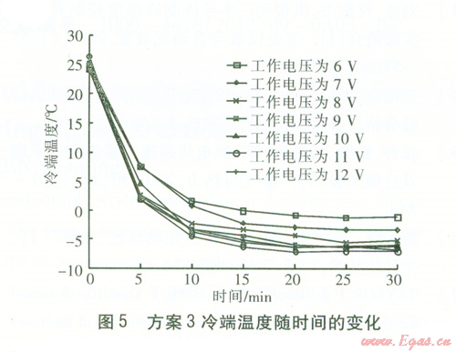 方案3冷端溫度隨時問的變化見圖5。由圖5可知,對于不同工作電壓,前16 min,冷端溫度下降明顯,且均降至