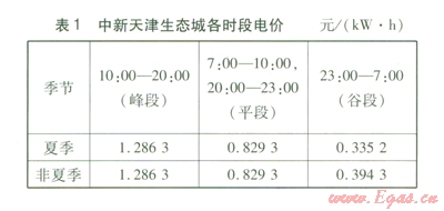 燃?xì)鈨r(jià)格按照2.4 元/m3計(jì)算,中新天津生態(tài)城各時(shí)段電價(jià)見(jiàn)表l。此外,燃?xì)廨啓C(jī)部分負(fù)荷率下降到0.5以下時(shí)熱效率下降嚴(yán)重,因此將燃?xì)廨啓C(jī)部分負(fù)荷率≥0.5作為約束條件。將以上參數(shù)輸入到優(yōu)化評(píng)價(jià)模型就可得到聯(lián)供系統(tǒng)的最優(yōu)設(shè)備配置和運(yùn)行策略。