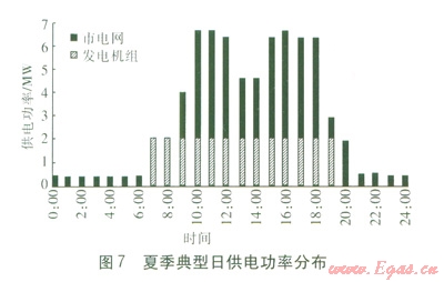 在動(dòng)漫園實(shí)行峰谷電價(jià)的基礎(chǔ)上,冬夏季典型日聯(lián)供系統(tǒng)的供熱量、供冷量、供電功率的分布見(jiàn)圖4~7。由于在優(yōu)化模型中考慮了設(shè)備負(fù)荷率等實(shí)際因素的影響,因此對(duì)于根據(jù)優(yōu)化結(jié)果進(jìn)行配置的方案,圖4~7即可反映全年典型目的各個(gè)設(shè)備啟停狀態(tài),即優(yōu)化配置方案下的運(yùn)行策略。