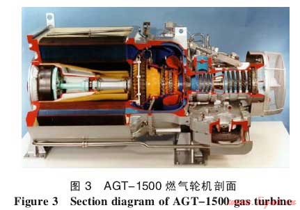 AGT-1500燃氣輪機的剖面見圖3。該燃氣輪機為三軸結構:低壓轉子、高壓轉子和動力渦輪轉子。5級軸流式低壓壓氣機帶可調進口導流葉片;高壓壓氣機由4級軸流式壓氣機和單級離心式壓氣機組成;每個壓氣機轉子由單級渦輪帶動,高壓渦輪導向葉片與工作葉片均為空心氣冷。2級動力渦輪帶可變幾何進口導流葉片,高壓壓氣機排出的空氣經回熱器被動力渦輪排出的燃氣加熱后再進入單管式燃燒室。燃氣輪機由全功能數字電子調節(jié)器自動控制。