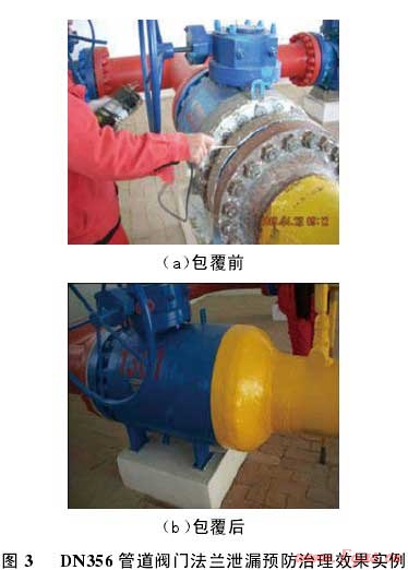 泄漏,然后按照上述施工流程對法蘭進行碳纖維復合材料堵漏加固處理,待復合材料養(yǎng)護固化后,進行耐壓密封試驗。結(jié)果表明:采用碳纖維復合材料進行管道法蘭滲漏治理,管道系統(tǒng)連接法蘭在 10 MPa 介質(zhì)壓力下,露天環(huán)境下穩(wěn)壓 14 d,堵漏區(qū)域無任何泄漏??梢姡撎准夹g方案對存在泄漏隱患的管道法蘭泄漏治理非常有效。由于該套技術方案具有作業(yè)不動火、操作安全、成本費用低等特點,2008-2011年,采用復合材料修復技術對西氣東輸全線 220 多個線路閥室旁通管道 DN356 閥門連接法蘭及各站場與干線連接的DN50 和 DN80 管道法蘭泄漏隱患進行治理(圖 3),在確保管道安全平穩(wěn)運行的同時,節(jié)約了大量維修費用。復合材料修復對法蘭結(jié)構具有一定的加固作用,可提高法蘭的抗軸向拉伸、彎曲能力,防止密封面泄漏情況進一步惡化。但是,對于已經(jīng)出現(xiàn)明顯泄漏的高壓(7 MPa 以上)法蘭,治理效果不佳。