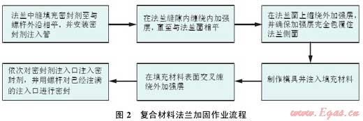 基本原理:對連接法蘭面間隙填充高強度堵漏密封材料,再用由高強度纖維與環(huán)氧粘結(jié)劑組成的復合材料對法蘭連接部位進行整體外包覆,待復合材料結(jié)構固化后,形成一個高強度殼體結(jié)構,實現(xiàn)整體加固,達到預防法蘭泄漏的目的(圖 2)。