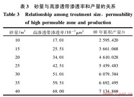 從表3知,隨著加砂規(guī)模的增大,高滲透帶的滲透率和壓裂后的產(chǎn)量逐漸增大,當(dāng)單簇高滲透帶加砂規(guī)模大于25m3時(shí),累積產(chǎn)量增加趨勢(shì)減緩。由圖7和圖8數(shù)值模擬結(jié)果知本井優(yōu)化的高滲透帶滲透率上限為40×10-3μm2,對(duì)應(yīng)的砂量為20~25m3。綜合考慮施工風(fēng)險(xiǎn),建議本井高滲透帶滲透率取30×10-3μm2左右,每簇高滲透帶的砂量為15~20m3。