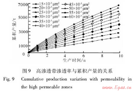 在建立的數(shù)值模型中嵌入高滲透帶,改變高滲透帶的特征參數(shù),通過(guò)數(shù)值模擬分析高滲透帶對(duì)累積產(chǎn)量和采出程度的影響。