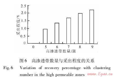 從圖5可見(jiàn),當(dāng)高滲透帶數(shù)量為0,即儲(chǔ)層不壓裂時(shí),此時(shí)井筒全靠?jī)?chǔ)層基質(zhì)滲流,10年時(shí)間的累積產(chǎn)量?jī)H1t,基本無(wú)產(chǎn)能;高滲透帶數(shù)量為7簇時(shí),累積產(chǎn)量4297t,采出程度1.72%;8簇時(shí),累積產(chǎn)量4993.7t,采出程度2.0%;9簇時(shí),累積產(chǎn)量5476.0t,采出程度2.19%(圖6)。
