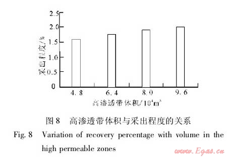圖7描述了高滲透帶數(shù)量為8簇時(shí),單簇高滲透帶體積與累積產(chǎn)量的關(guān)系。單簇高滲透帶體積為8.0×104m3時(shí),累積產(chǎn)量為4790.8t,采出程度1.9%;高滲透帶體積為9.6×104m3時(shí),累積產(chǎn)量4995.8t,采出程度2.0%(圖8)??梢?jiàn),隨著高滲透帶體積增加,累積產(chǎn)量、采出程度增加,當(dāng)單簇高滲透帶體積大于8.0×104m3時(shí),累積產(chǎn)量、采出程度增加減緩。為最大限度地提高本井采出程度,兼顧斷層影響,最終確定單簇高滲透帶體積為9.6×104m3。