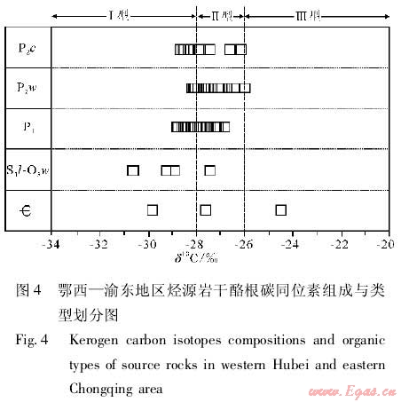 (3)本區(qū)長興組和飛仙關(guān)組天然氣的氣源巖主要為二疊系吳家坪組(P2w)烴源巖,且以Ⅱ型有機質(zhì)為主,能夠生成大量的原油,具備原油裂解作用發(fā)生的物質(zhì)基礎(chǔ)。對于本區(qū)高成熟度的天然氣而言,利用同位素資料進行氣—巖對比是比較可靠的方法。本區(qū)侏羅系和石炭系天然氣的丁烷碳同位素分別為-25.0‰和-31.9‰,而三疊系天然氣丁烷的含量低,只測得丙烷碳同位素為-27.6‰,下志留統(tǒng)龍馬溪組(S1l)、吳家坪組(P2w)和侏羅系源巖干酪根的碳同位素均值分別為-30.0‰、-27.0‰和-25.5‰(圖3)。有研究表明,具有氣源關(guān)系的烴源巖的干酪根碳同位素比天然氣丁烷的碳同位素要重1.0‰左右[15]。根據(jù)這種對應(yīng)關(guān)系,侏羅系、三疊系飛仙關(guān)組和石炭系的天然氣應(yīng)該分別來源于侏羅系、二疊系吳家坪組和志留系龍馬溪組烴源巖(圖3)。從生儲配置關(guān)系來看,飛三段與上覆侏羅系之間有較厚的隔層,其氣源也不可能來自于侏羅系烴源巖;并且飛三段天然氣的碳同位素組成明顯重于石炭系天然氣(圖3),其不可能與石炭系天然氣具有相同的氣源巖。對于本區(qū)高過成熟的二疊系烴源巖(Ro均值為2.2%)而言,其有機質(zhì)類型用常規(guī)熱解和元素組成數(shù)據(jù)很難判斷[16],比較可靠的方法是利用源巖干酪根碳同位素數(shù)據(jù)進行分析。本區(qū)二疊系吳家坪組烴源巖的干酪根碳同位素值為-26.0‰~-28.2‰,與Ⅱ型有機質(zhì)具有較好的對應(yīng)關(guān)系;志留系烴源巖的干酪根碳同位素在-27.0‰~-31.0‰,主要為Ⅰ型有機質(zhì);寒武系烴源巖的干酪根碳同位素比較分散,類型可能比較復(fù)雜(圖4)。根據(jù)上述分析,本區(qū)吳家坪組烴源巖有機質(zhì)類型主要為Ⅱ型,以生油為主。
