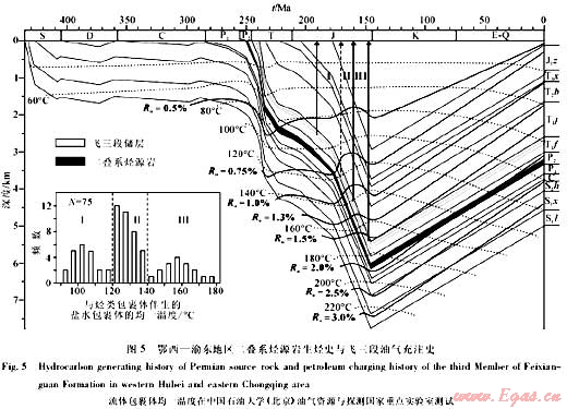 飛三段油氣充注史主要根據(jù)飛三段儲層與烴類包裹體伴生的鹽水包裹體的均一溫度與儲層埋藏?zé)崾反_定。通過鏡下觀察,發(fā)現(xiàn)本區(qū)飛三段儲層膠結(jié)物中可見較多瀝青包裹體和天然氣包裹體,以及少量油包裹體。據(jù)前人研究,瀝青包裹體為油包裹體經(jīng)歷高溫之后的殘留產(chǎn)物[19],因此,可測定與瀝青包裹體伴生的鹽水包裹體的均一溫度代表古原油充注時的溫度。均一溫度的測定與統(tǒng)計結(jié)果(圖5):與瀝青包裹體伴生的鹽水包裹體的均一溫度在90~120℃;與天然氣和少量瀝青包裹體伴生的鹽水包裹體的均一溫度在120~140℃;與天然氣包裹體伴生的鹽水包裹體的均一溫度在140~180℃。把這3期均一溫度投影到地層埋藏史圖上(圖5),可知第Ⅰ期和第Ⅱ期大致與二疊系烴源巖的生油期相對應(yīng),而第Ⅲ期與烴源巖的生氣階段對應(yīng)。因此,認為飛三段在侏羅紀(jì)主要發(fā)生了3期油氣充注:第Ⅰ期主要為原油充注;第Ⅱ期為原油充注,伴有天然氣充注;第Ⅲ期主要為天然氣充注。第Ⅲ期的天然氣充注,可能主要與儲層古原油裂解產(chǎn)生的天然氣有關(guān)。根據(jù)前人研究成果,認為150℃是原油穩(wěn)定存在的上限溫度[20],而飛三段儲層在晚侏羅世的最高溫度接近180℃,表明具備原油裂解作用發(fā)生的溫度條件,飛三段古油藏在晚侏羅世基本全部裂解成氣藏。原油裂解作用發(fā)生的時間與第Ⅲ期天然氣充注的時間吻合,進一步證明儲層中發(fā)生了原油裂解作用。