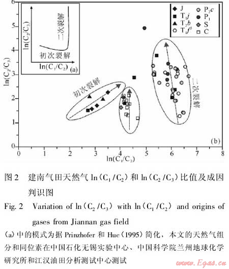 (1)天然氣的成分組成具有原油二次裂解氣的特征。飛三段(T1f3)和長興組(P2c)天然氣的烷烴氣中以甲烷為主(相對含量在99%以上),為成熟度很高的干氣。有機成因的烷烴氣大致包括生物氣、干酪根熱解氣和原油裂解氣。本區(qū)天然氣甲烷的碳同位素在-30.0‰~-33.0‰,可排除生物成因氣。因此,對本區(qū)天然氣的成因判識的關(guān)鍵是區(qū)分干酪根熱解氣和原油裂解氣。這兩類成因天然氣,目前國內(nèi)外學(xué)者主要用ln(C1/C2)與ln(C2/C3)關(guān)系圖進行判識[10-13]。干酪根初次熱解氣以甲烷的迅速增加為特征,ln(C1/C2)值不斷增大而ln(C2/C3)值相對穩(wěn)定;原油二次裂解氣以丙烷的迅速減少為特征,ln(C2/C3)值明顯增大而ln(C1/C2)值變化不大(圖2(a))。如圖2(b),研究區(qū)嘉陵江組(T1j)、飛三段(T1f3)、長興組(P2c)和下二疊統(tǒng)(P1)天然氣的ln(C1/C2)值在5~7,ln(C2/C3)值在1~4,總體符合ln(C2/C3)迅速增大、ln(C1/C2)相對穩(wěn)定的原油二次裂解氣的基本特征,志留系(S)與石炭系(C)的天然氣(ln(C1/C2)值在4~5,ln(C2/C3)值在1~2.5)也具有類似的特征,但分布范圍與前者明顯區(qū)別,表明這兩類天然氣的來源可能不同。三疊系巴東組(T2b)和侏羅系(J)的天然氣的ln(C1/C2)值在2.5~3.5,ln(C2/C3)值在1~2.5,總體表現(xiàn)為ln(C1/C2)值不斷增大而ln(C2/C3)值相對穩(wěn)定的干酪根初次熱解氣的特征。