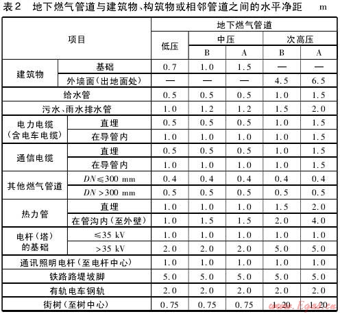 城鎮(zhèn)燃?xì)夤艿缐毫Ψ旨?jí)及地下燃?xì)夤艿琅c建筑物、構(gòu)筑物或相鄰管道之間水平凈距分別見表1,表2。