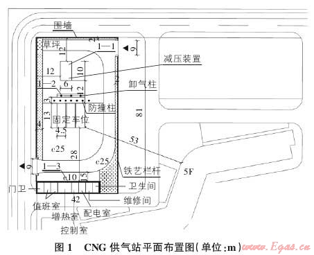 2) 總平面布置。根據(jù) GB 50028-2006 第7.3.11的要求,CNG供氣站本站總平面應(yīng)分區(qū)布置,本工程站區(qū)分為生產(chǎn)區(qū)和生產(chǎn)輔助區(qū)。生產(chǎn)區(qū)由工藝裝置區(qū)、卸氣柱、壓縮煤層氣撬車區(qū)組成,壓縮煤層氣撬車固定車位最大儲(chǔ)氣總?cè)莘e為8000m3,撬車固定車位四周有足夠的回車場(chǎng)地,生產(chǎn)區(qū)布置在站區(qū)以北。生產(chǎn)輔助區(qū)主要出入口布置于場(chǎng)區(qū)西南側(cè),并在場(chǎng)區(qū)形成環(huán)形消防通道,場(chǎng)區(qū)中間設(shè)置固定車位3個(gè),設(shè)置3個(gè)卸氣柱,減壓裝置和調(diào)壓裝置位于場(chǎng)區(qū)北側(cè)。新建建筑物有: 值班室、控制室、變配電室、增熱室、維修間、門衛(wèi)、衛(wèi)生間等,布置在場(chǎng)區(qū)南側(cè)。場(chǎng)區(qū)四周設(shè)置高度2m的圍墻及車輛出、入口。出、入口道路與站外規(guī)劃路銜接,滿足人流疏散及車輛安全行駛。平面布置如圖 1 所示。