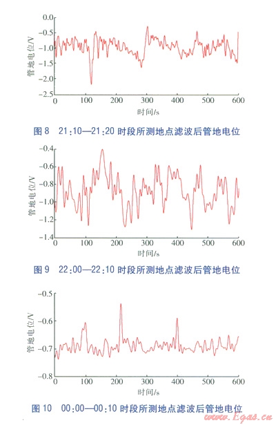 由各時段管地電位變化可得,軌道交通運行期間管地電位存在很大波動,圖2為軌道交通正常運行期間機(jī)車通過測試點時管地電位變化,電位波動有明顯峰值,極大值與極小值分別為0 V、-2.5 V; 圖4為單列運行期間無機(jī)車通過測試點時管地電位變化,由于其他位置通過機(jī)車電流的影響,管地電位仍有明顯波動,但幅值較機(jī)車通過時刻有所減?。粓D6中軌道交通停運后,管地電位波動明顯減小,但高頻采集數(shù)據(jù)中存在干擾信號,數(shù)據(jù)頻繁對稱波動,需要進(jìn)行濾波處理。所測結(jié)果表明所測地段燃?xì)夤艿朗艿诫s散電流干擾,且雜散電流的產(chǎn)生與軌道交通運行有直接關(guān)系。
