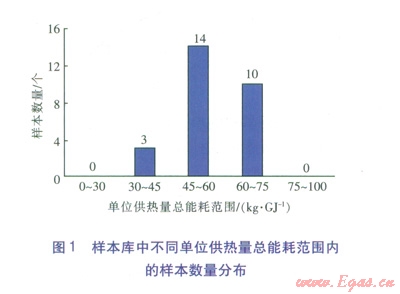 樣本庫(kù)中不同單位供熱量總能耗范圍內(nèi)的樣本數(shù)量分布見(jiàn)圖l。