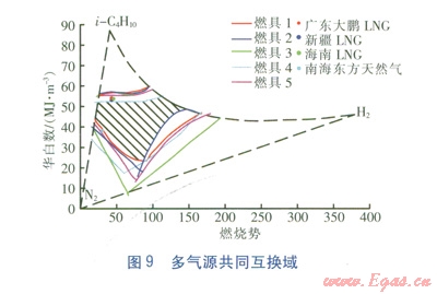 課題組探索形成了完整的試驗(yàn)測(cè)定城市多氣源“共同互換域”的方法和技術(shù)路線,形成了量化、科學(xué)的城市多氣源互換性測(cè)試技術(shù)。5種常用大氣式燃具在i-C4H10、H2、N2三組分試驗(yàn)氣全域區(qū)間中的共同適應(yīng)域(即多氣源的共同互換域,圖9中陰影部分),以及4種超出多氣源共同互換域的氣源見(jiàn)圖9.