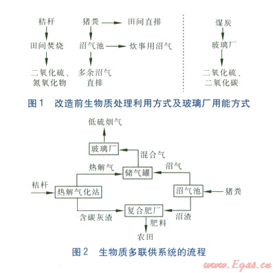 湘潭縣某玻璃廠生產(chǎn)能耗巨大,燃煤成本占年運(yùn)營(yíng)成本的25%,生產(chǎn)過程中排放大量S02、C02。經(jīng)調(diào)研發(fā)現(xiàn),湘潭縣被譽(yù)為“全國(guó)養(yǎng)豬第一縣”,該玻璃廠所在村莊建有130多口沼氣池,主要以當(dāng)?shù)氐呢i糞為原料,產(chǎn)生的沼氣除部分用于炊事外,其他均排至大氣。另外,由于豬糞產(chǎn)量巨大,在滿足沼氣池使用之外仍有過剩豬糞直排田間,在開放環(huán)境下產(chǎn)生甲烷、二氧化碳等。據(jù)初步估算,外排沼氣和過剩豬糞每年向環(huán)境排放的溫室氣體折合成二氧化碳約2 800 t/a。當(dāng)?shù)赜袊?guó)家級(jí)超級(jí)水稻大規(guī)模推廣基地,目前村民大多采用田間焚燒的方法處理秸稈,大量生物質(zhì)能被浪費(fèi),排放大量二氧化硫及氮氧化物。