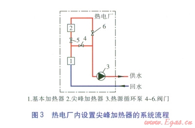 熱電廠內(nèi)設(shè)置尖峰鍋爐房(系統(tǒng)流程見圖2)。由圖2可知,熱水經(jīng)過基本加熱器加熱后進(jìn)入熱網(wǎng)熱負(fù)荷主干線。當(dāng)供暖期處于初末寒期時(shí),旁通閥開啟,尖峰鍋爐房不投入運(yùn)行。當(dāng)進(jìn)入嚴(yán)寒期時(shí),旁通閥關(guān)閉,尖峰鍋爐房投入運(yùn)行,基本加熱器出水經(jīng)尖峰鍋爐房加熱至設(shè)計(jì)溫度,進(jìn)入熱網(wǎng)主干線。對于這種設(shè)置方式,峰荷熱源的投資、運(yùn)營方均為熱電廠。
