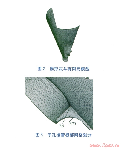 錐形灰斗有限元模型見圖2。將幾何模型共劃分成68 545個單元,l37 373個節(jié)點。手孔接管根部網(wǎng)格劃分見圖3,圖中數(shù)值單位為mm。