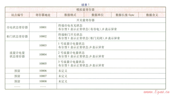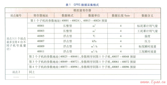 完整的遠(yuǎn)傳抄表數(shù)據(jù)包內(nèi)有兩種類型的數(shù)據(jù),一種是模擬量數(shù)據(jù),如流量、壓力、溫度等,通過(guò)內(nèi)部控制模塊轉(zhuǎn)換成數(shù)字量數(shù)據(jù);另一種是狀態(tài)信號(hào)數(shù)據(jù),如市電狀態(tài)、采集終端柜門狀態(tài)等開關(guān)量數(shù)據(jù)。GPRS數(shù)據(jù)采集格式見表l。