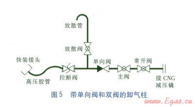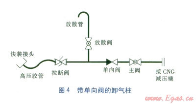 在卸氣柱卸氣過程中,由于工作人員的疏忽,在更換第二輛CNG氣瓶車時(shí),誤操作將第一輛和第二輛CNG氣瓶車所連接的卸氣柱主閥同時(shí)打開。這時(shí)就會(huì)造成第二輛車內(nèi)的CNG反充入第一輛車(尤其是CNG減壓橇流量不大的時(shí)候),使得第一輛車內(nèi)的余氣量增加,影響正常運(yùn)營(yíng)。為了防止工作人員誤操作所帶來的問題,可以在卸氣柱主閥的前面增加一個(gè)單向閥。帶單向閥的卸氣柱見圖4。