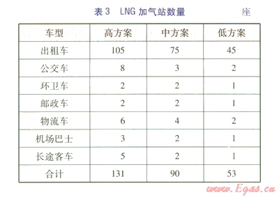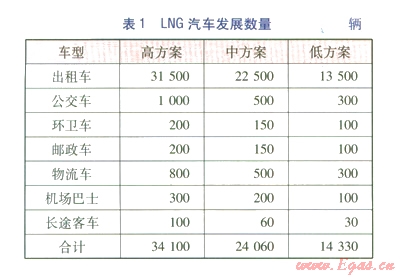 預(yù)測LNG長途客車的發(fā)展為高方案100輛、中方案60輛、低方案30輛。按日加氣l