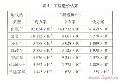 根據(jù)LNG車輛用戶的特點及北京市的實際情況確定加氣站的建設(shè),郵政車、物流車以及50%出租車的加氣站采用與規(guī)劃的加油站建合建站,分別進行管理;公交車、環(huán)衛(wèi)車、機場巴士、長途客車以及50%出租車的加氣站考慮改造有條件的已建加油站進行聯(lián)合建站。各方案的工程造價估算見表4。