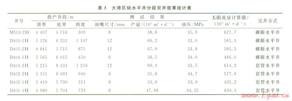 上述完井管柱應(yīng)用于大灣區(qū)塊4口裸眼水平井和4口套管水平井的分段完井投產(chǎn)作業(yè),完井管柱下入順利,作業(yè)過程安全可控,首次實(shí)現(xiàn)了國內(nèi)高含硫水平井分段改造,儲(chǔ)層改造施工安全順利,增產(chǎn)效果明顯(表3)。