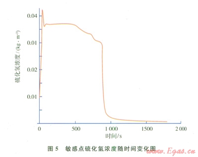 對于含硫天然氣擴散引起的風(fēng)險,需要計算特定位置硫化氫含量的變化情況,即各網(wǎng)格點或敏感目標處硫化氫含量隨時間變化情況。分別以某井場井噴和某天然氣凈化裝置事故為例,得到事故發(fā)生時硫化氫的時空分布情況(圖2~5)。