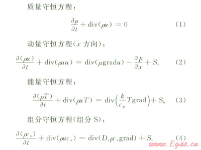 CFD可以看作是在流動基本方程(質(zhì)量守恒方程、動量守恒方程、能量守恒方程)控制下對流動數(shù)值的模擬。通過這種數(shù)值模擬,可以得到極其復(fù)雜問題的流場內(nèi)各個位置上基本物理量(如速度、壓力、溫度、濃度等)的分布,以及這些物理量隨時間的變化情況。由于含硫天然氣是混合物質(zhì),因此,控制方程還應(yīng)包括組分守恒方程。4個方程的表達式如下。