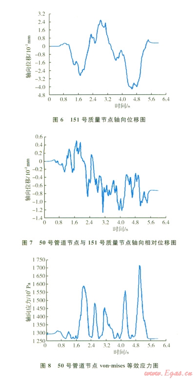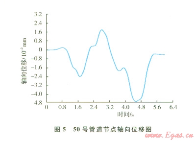 圖8顯示了管道50號節(jié)點von-mises等效應(yīng)力在整個爆破地震波作用周期內(nèi)的變化趨勢,在第4.8 s時管道中間節(jié)點應(yīng)力達(dá)到170 MPa,仍然處于彈性階段。由于描述地震破壞作用的主要參數(shù)是軸向應(yīng)變,而此算例的軸向應(yīng)變最大值為0.0011,與采用抗震規(guī)范法中計算出的最大軸向應(yīng)變?yōu)?span lang="EN-US">0.001 3極為接近,也證明了模擬結(jié)果的準(zhǔn)確性。
