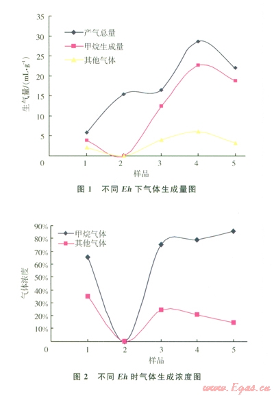 筆者在實驗室條件下模擬了不同Eh條件下生物甲烷生成的情況,對不同條件下產出的氣體及甲烷含量進行分析,并對甲烷在不同反應階段的生成方式進行了探討,實驗結果表明: