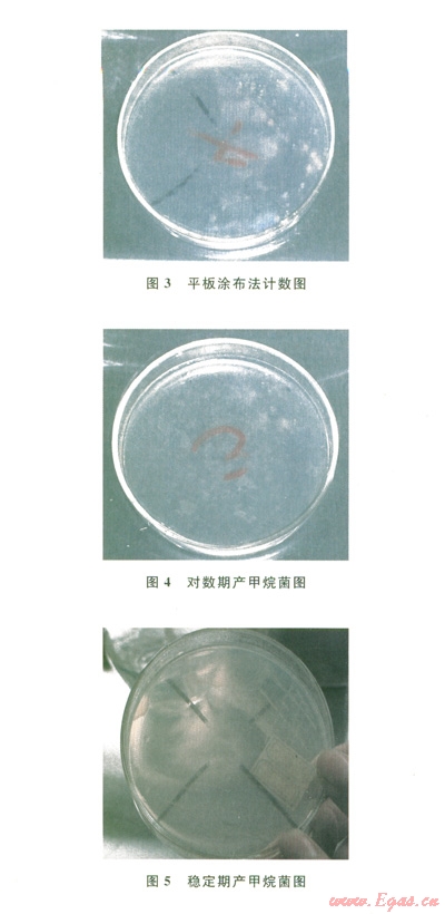 從接種培養(yǎng)的結果可以看出,細菌的生長個數(shù)與氧化還原電位有一定的關系,在高氧化還原電位時產甲烷菌的數(shù)量較少,隨著氧化還原電位的降低,基本趨勢是細菌生長的個數(shù)越來越多。由此認為,氧化還原電位是產甲烷發(fā)酵的重要限制因子,較低的適合的氧化還原電位可以促進產甲烷菌體內的酶系的活性,使其調整代謝方式和速率,加快生長繁殖。另對-284mV的氧化還原電位值的產甲烷菌進行為期90d的培養(yǎng)觀察,菌種的平板培養(yǎng)結果如圖3~5所示。