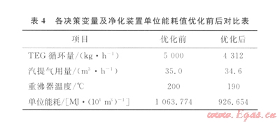 以現(xiàn)場(chǎng)運(yùn)行數(shù)據(jù)為依據(jù),確定各決策變量的變化范圍為:TEG循環(huán)量(z。)為2 500~4 500 kg/h;TEG再生器塔底重沸器溫度(x1)為1 80~204℃;TEG再生器汽提氣用量(x2)為20~60 m3/h。通過(guò)均勻設(shè)計(jì)的實(shí)驗(yàn)方法來(lái)確定實(shí)驗(yàn)表,調(diào)試、運(yùn)行基于BP和GA的能耗優(yōu)化模型。表4為各決策變量及凈化裝置單位能耗值優(yōu)化前后對(duì)比情況。