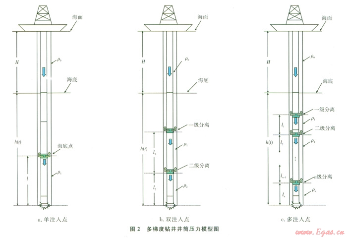 隨著陸上和淺海油氣資源的持續(xù)不斷開發(fā),勘探開發(fā)轉(zhuǎn)向海洋尤其轉(zhuǎn)向深水已成為必然。但與陸地和淺海鉆井相比,深水海域特殊的自然環(huán)境和復(fù)雜的油氣儲藏條件產(chǎn)生了常規(guī)鉆井裝備和工藝難以克服的技術(shù)難題[1]:采用錨泊定位鉆機本身必須承受笨重的錨泊系統(tǒng)的重量,給鉆機定位增加了難度;隔水管除了承受自身重量,還需要承受諸如海流及惡劣的海洋環(huán)境載荷;在海底泥線處的高壓和低溫環(huán)境對鉆井液性能影響;海底的不穩(wěn)定性、淺層水流動、天然氣水合物控制對鉆井的風(fēng)險;對于常規(guī)鉆井工藝,尤其難于控制井筒鉆井液循環(huán)當(dāng)量密度在允許的作業(yè)壓力窗口之間。針對井筒壓力控制難度較大的問題,國外20世紀90年代提出和發(fā)展的雙梯度鉆井技術(shù)[2]。目前已實施5個聯(lián)合工業(yè)項目,并取得了階段性成果[3],提出了多套技術(shù)方案,包括海底泵舉升鉆井液、隔水管氣舉、隔水管稀釋以及注空心玻璃球(Hollow Glass Spheres,簡稱空心球)等,以實現(xiàn)井筒壓力的優(yōu)化控制。本文基于雙梯度鉆井技術(shù),提出了多梯度鉆井技術(shù),該技術(shù)比雙梯度鉆井能更好地匹配地層壓力,使井底壓力在較長的距離內(nèi)介于地層壓力和破裂壓力之間,能夠簡化深水復(fù)雜井身結(jié)構(gòu),有效控制井筒環(huán)空壓力,實現(xiàn)安全鉆進,同時提高鉆進效率。