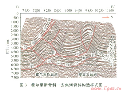 南緣沖斷帶霍、瑪、吐構(gòu)造深層發(fā)育三角楔構(gòu)造。圖3為過(guò)霍爾果斯與安集海背斜的一條區(qū)域剖面?;魻柟贡承鄙畈康臉?gòu)造三角楔由霍安斷裂與一個(gè)反向沖斷層組成。沿中下侏羅統(tǒng)發(fā)育的滑脫斷層向上突破白堊系,再沿白堊系滑脫,前鋒向上突破控制了北部安集海背斜中淺層背斜特征?;舭矓嗔言诨魻柟贡承毕蛏贤黄瓢讏紫档倪^(guò)程中(前沖斷層),同時(shí)伴生一個(gè)反向的沖斷層(反沖斷層),形成霍爾果斯背斜深部構(gòu)造三角楔。可以看出構(gòu)造三角楔前端向斜軸面位置與三角楔前緣端點(diǎn)位置一致,符合構(gòu)造三角楔幾何變形原理。