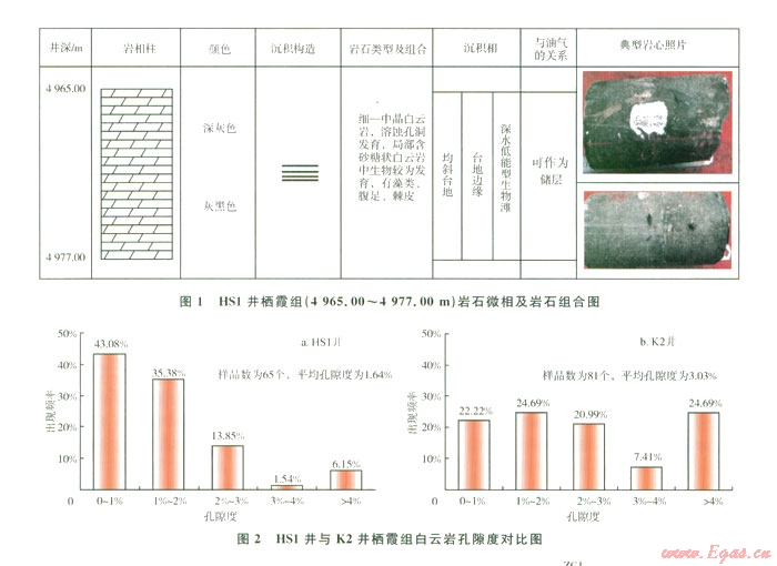 當(dāng)儲(chǔ)層內(nèi)的流體為低礦化度的地層水或淡水時(shí),由于水中呵移動(dòng)的導(dǎo)電離子數(shù)大量減少,從而導(dǎo)致電阻率值增加,在測(cè)井電阻率曲線上則表現(xiàn)出高電阻率特征。由于隨著勘探程度的不斷提高,勘探家們?cè)絹?lái)越認(rèn)識(shí)到淡水地層的電阻率類(lèi)同氣層,電阻率值較高,因而按常規(guī)解釋易出偏差,這也是HS1井柄霞組水層呈現(xiàn)出高電阻率特征易解釋失誤的原因。K2井棲霞組巖性主要為淺灰-灰色細(xì)-中晶白云巖,粗晶(砂糖狀)白云巖發(fā)育。巖心分析物性表明,孔隙度分布范圍介于0.42%~l 6.61%,孔隙度在各個(gè)區(qū)間分布較為平均,平均孔隙度為3.03%,明顯較HS1井高(圖2),儲(chǔ)層物性特征明顯較致密的HS1井好,屬于中等-好儲(chǔ)層。從K2井儲(chǔ)層測(cè)井解釋看,棲霞組儲(chǔ)層電性特征具有低伽馬值、高電阻率、相對(duì)較高的聲波時(shí)差特征,無(wú)疑具有典型的氣層特征(圖5)。但通過(guò)該井MDT取樣分析卻表明:儲(chǔ)層段產(chǎn)水。根據(jù)本井MDT水樣分析資料,其Cl-含量?jī)H164 mg/L礦化度低,反映儲(chǔ)層中的水為淡水特征。