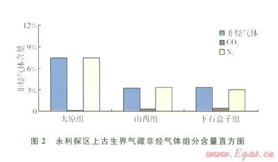 大量的測(cè)試資料統(tǒng)計(jì)結(jié)果顯示,研究區(qū)上古生界天然氣中非烴組分含量分布范圍介于3.24%~7.49%,主要為二氧化碳和氮?dú)猓瑲錃?、氦氣等組分的含量極低,一般小于0.1%,未檢測(cè)到硫化氫。