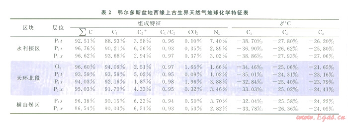 研究區(qū)氣藏除了來自本區(qū)山西組-羊虎溝組太原組煤系烴源巖的自生自儲(chǔ)型氣源外,也有可能接受東側(cè)天環(huán)向斜早期的側(cè)向供烴。天環(huán)向斜北部二疊系下部(山西組、太原組)和石炭系羊虎溝組有效烴源巖的目前的成熟度為I.35%~2.0%,區(qū)域資料證實(shí)其在西緣構(gòu)造定型之前與西緣的源巖演化較為一致,西緣構(gòu)造隆升除了可以接受本區(qū)下部烴源巖的垂向供烴外,也可以接受天環(huán)向斜的側(cè)向供烴。另外,研究區(qū)天然氣組分特征及輕烴同位素特征與天環(huán)北段有一定的相似性(表2),表明其有可能是同源的天然氣,因而不能排除天環(huán)向斜為其來源之一。