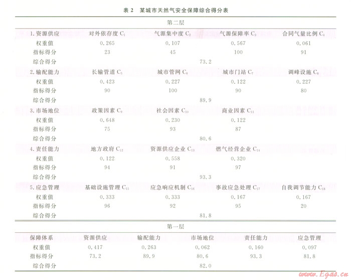 基于上述判斷矩陣,計算某城市的天然氣供應(yīng)保障模型綜合得分,綜合得分是指各項評價指標得分與權(quán)重值的加權(quán)求和,得到該城市的綜合得分為82.0分,計算結(jié)果見表2。